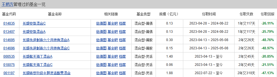 王柄方擔(dān)任基金經(jīng)理已經(jīng)有2年時(shí)間,但管理的基金業(yè)績(jī)很不理想。目前在管基金資產(chǎn)總規(guī)模3.33億元,在管及管理過(guò)的產(chǎn)品共4只,均為混合型產(chǎn)品,任期回報(bào)在-20%至-49%之間。