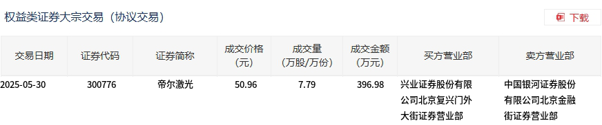 5月30日,帝爾激光大宗交易成交7.79萬股,成交額396.98萬元,占當(dāng)日總成交額的4.02%,成交價50.96元,較市場收盤價53.63元折價4.98%。