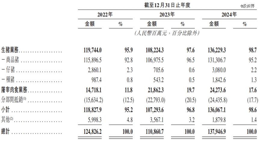 產(chǎn)品方面,公司主要銷(xiāo)售生豬(即商品豬、仔豬及種豬)以及鮮、凍肉類(lèi)產(chǎn)品,其中又以商品豬為主。2022年、2023年及2024年,來(lái)自商品豬的收入分別占總收入的92.8%、96.5%及95.2%。