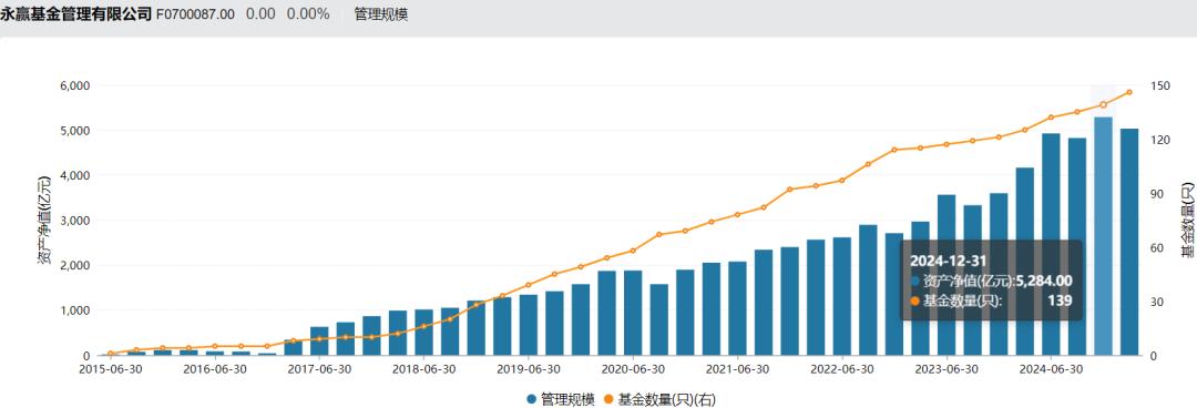 雖因市場環(huán)境變化出現(xiàn)短期波動,但永贏基金整體規(guī)模持續(xù)擴(kuò)張。2017年至2024年末,7年增長超50倍,背后離不開高管團(tuán)隊?wèi)?zhàn)略的確定性。