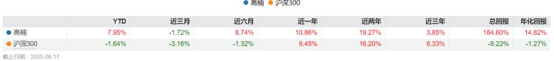 截至目前,高楠管理8只產(chǎn)品,規(guī)模118.41億元,年化回報14.82%,近一年、近兩年業(yè)績跑贏滬深300,分別為10.86%、19.27%。