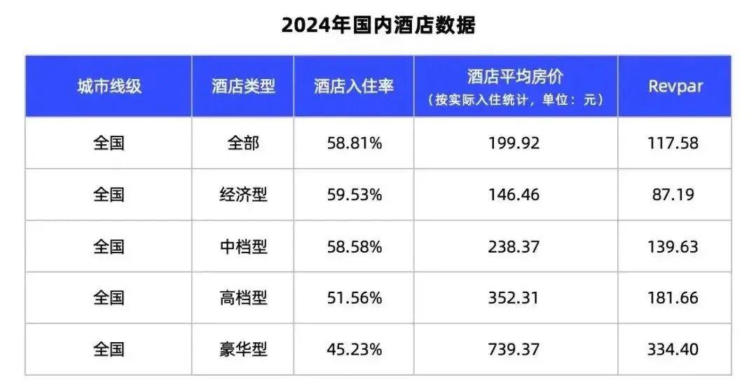 RevPAR(單間可售房間的收入)方面,華住集團(tuán)2025年一季度財(cái)報(bào),其RevPAR為208元/晚,同比下降4%,創(chuàng)2023年疫情恢復(fù)以來(lái)新低。2024年,國(guó)內(nèi)酒店業(yè)的平均房?jī)r(jià)有所回落,整體RevPAR為118元,同比下降9.7%。