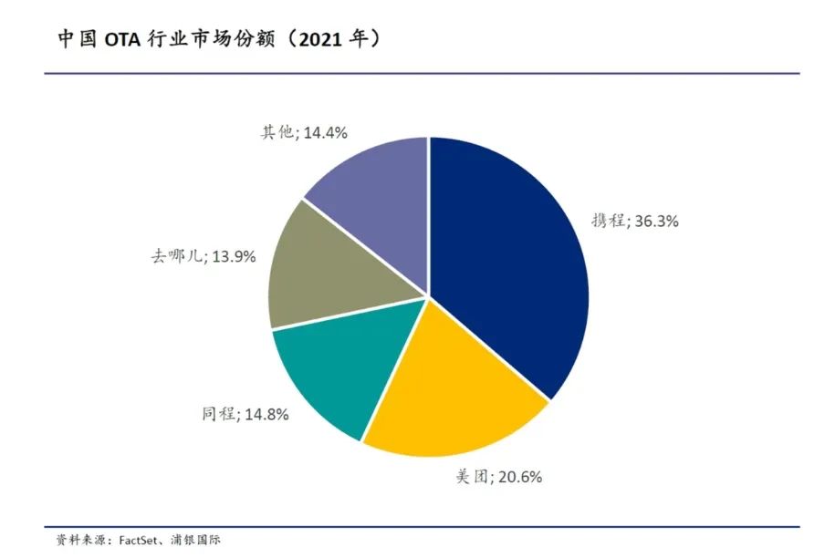 但在OTA領(lǐng)域,頭部效應(yīng)更加明顯。有關(guān)OTA的市場(chǎng)份額,目前機(jī)構(gòu)普遍采用的是2021年以GMV計(jì)算的市場(chǎng)份額,攜程+去哪兒占據(jù)了市場(chǎng)份額的約5成。此外還有市場(chǎng)份額也超過(guò)10%的同程旅行,雖然其最大股東雖然是騰訊,但攜程也已對(duì)其注資,外界有時(shí)也將會(huì)將其視為“攜程系”。