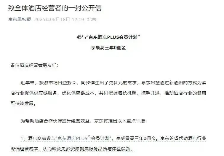 6月18日當(dāng)天,以一封公開(kāi)信高調(diào)宣布了“京東酒店P(guān)LUS會(huì)員計(jì)劃”。
