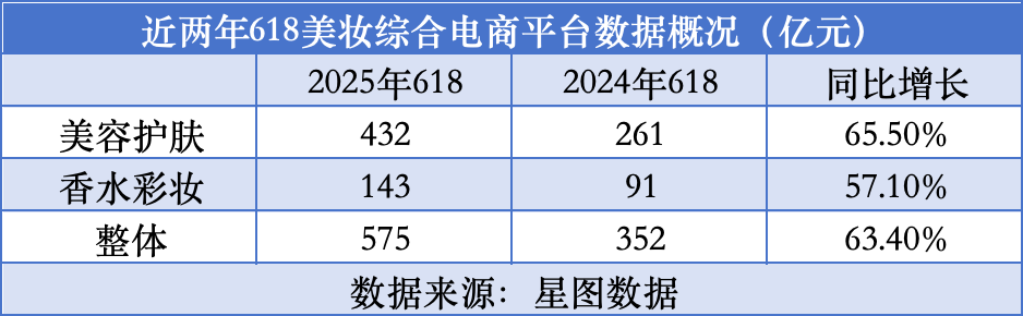 在綜合電商平臺(tái)上,美妝類目銷售總額達(dá)575億元,同比去年618全周期上漲了63.4%。具體來看,全網(wǎng)美容護(hù)膚總額同比上漲65.5%至432億元,全網(wǎng)香水彩妝總額同比上漲57.1%至143億元。
