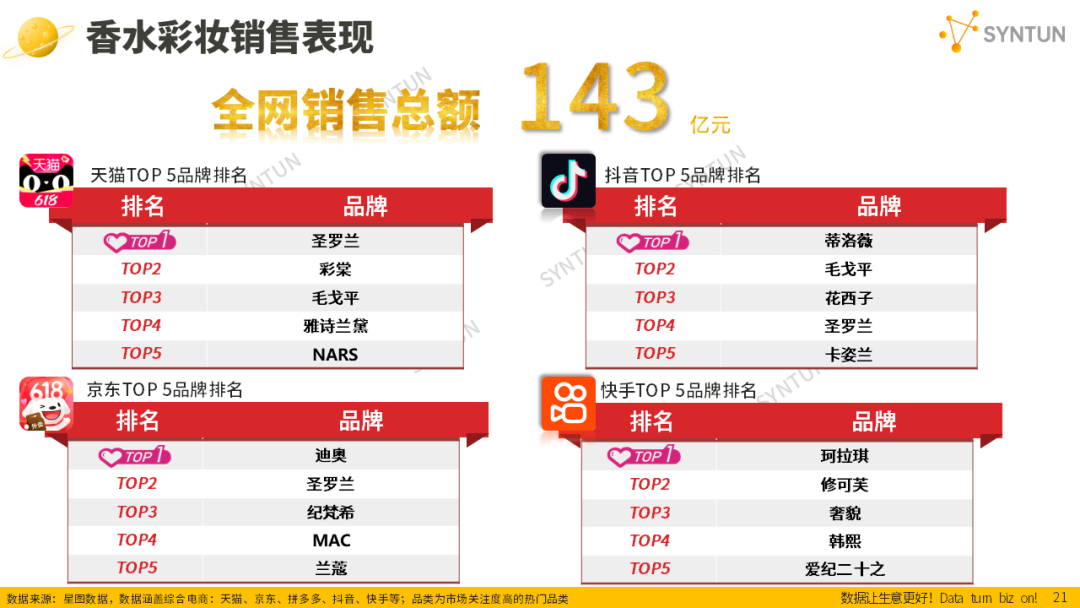 圣羅蘭登三大平臺(tái)香水彩妝TOP榜。與美容護(hù)膚TOP5榜單一樣,在京東平臺(tái)上,外資大牌具有絕對(duì)優(yōu)勢(shì),無一國產(chǎn)彩妝品牌躋身榜單。其中,排名TOP2的圣羅蘭,在天貓彩妝香水榜、抖音彩妝香水榜中,分別占據(jù)TOP1、TOP4之位,是唯一一個(gè)登上三大平臺(tái)TOP榜的品牌。