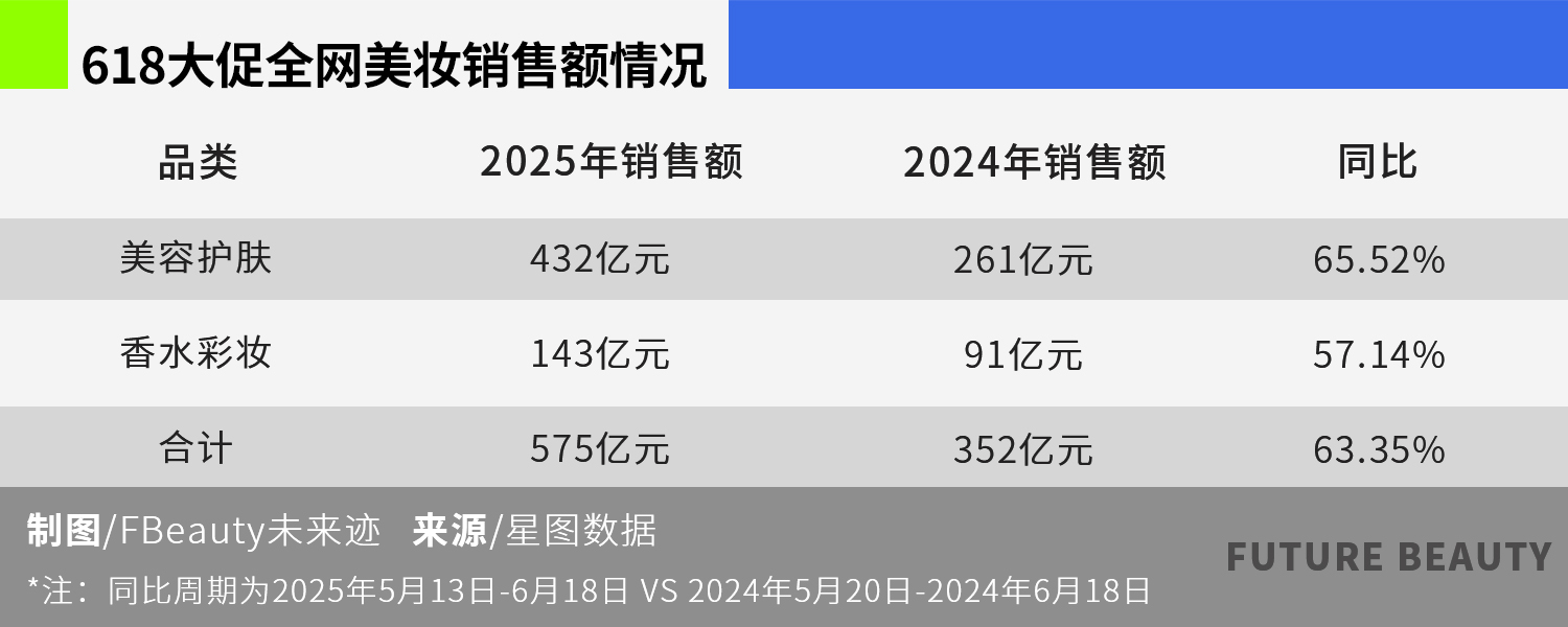 其中美容護(hù)膚實現(xiàn)全網(wǎng)銷售總額432億元,同比去年618大促,增長了65.52%;香水彩妝為143億元,同比增長57.14%,兩品類相加后同比共增長63.35%。對比2024年同期美容護(hù)膚與香水彩妝全網(wǎng)分別下滑13%及14.15%的數(shù)據(jù),今年618可以說創(chuàng)下歷史新高。