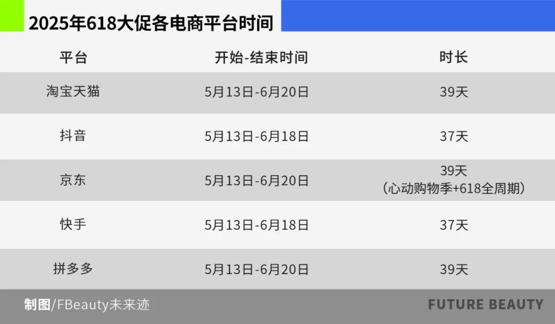 今年618大促周期的確再度拉長,5月13日成為了京東、天貓、抖音等多個電商平臺預(yù)售開啟節(jié)點(diǎn),各平臺618大促全周期基本都在35-40天的區(qū)間內(nèi),堪稱“史上最長618”。