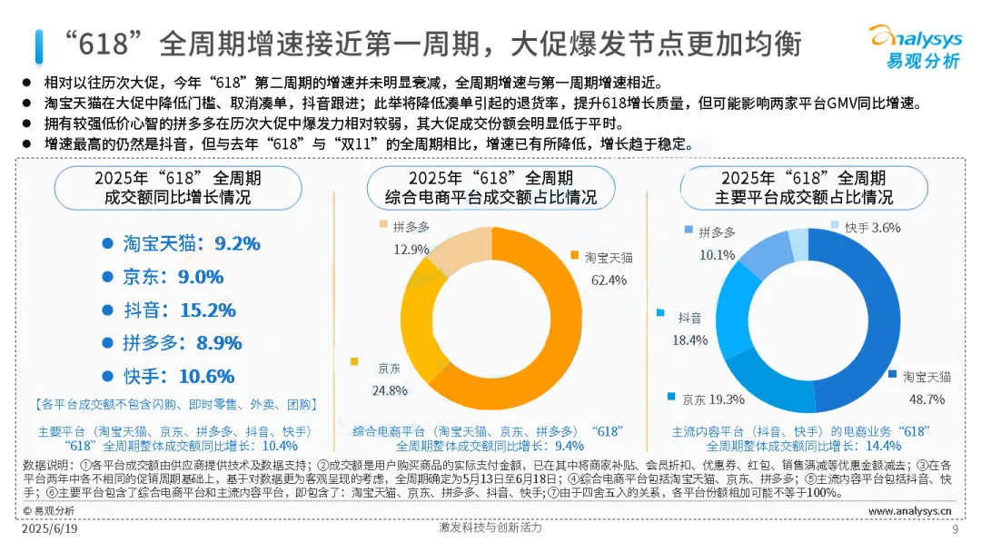 就平臺表現(xiàn)來看,易觀分析指出,2025年618全周期(5月13日-6月18日)主流電商平臺成交額占比為:淘寶天貓48.7%、京東19.3%、抖音18.4%、快手和拼多多共計13.7%。綜合來看,天貓?zhí)詫?、京東、抖音位列今年618線上交易平臺前三名。