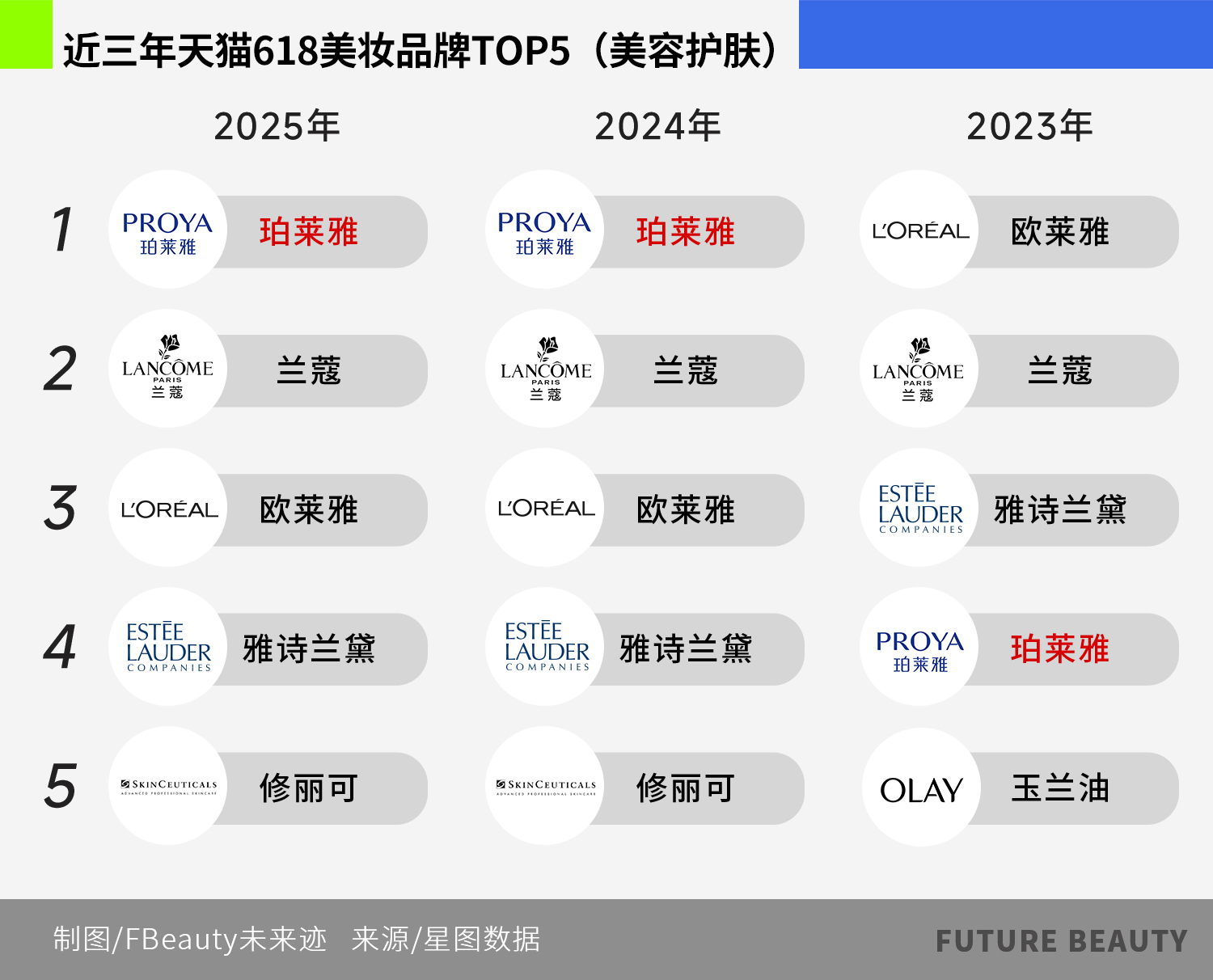 就星圖數(shù)據(jù)發(fā)布的天貓618近三年美妝品牌的排名情況看,美容護(hù)膚的排名情況變化不大,與2024年相同,今年的TOP5品牌分別為珀萊雅、蘭蔻、歐萊雅、雅詩蘭黛、修麗可。珀萊雅穩(wěn)住了第一的席位,歐萊雅集團(tuán)頭部品牌矩陣優(yōu)勢依舊突出,其品牌蘭蔻、歐萊雅、修麗可在前五中占據(jù)了三個席位。