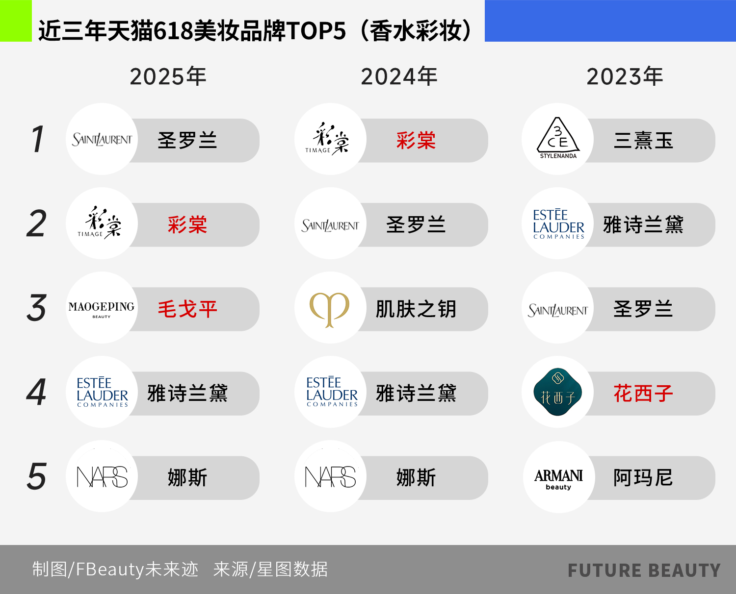 香水彩妝的排名變化較大,歐萊雅集團(tuán)旗下的圣羅蘭表現(xiàn)強(qiáng)勁,從2023年的第三名,一路上漲至第一。盡管彩棠從去年的第一下滑至第二,但是毛戈平?jīng)_上榜單第三,為國貨再奪得一個席位。