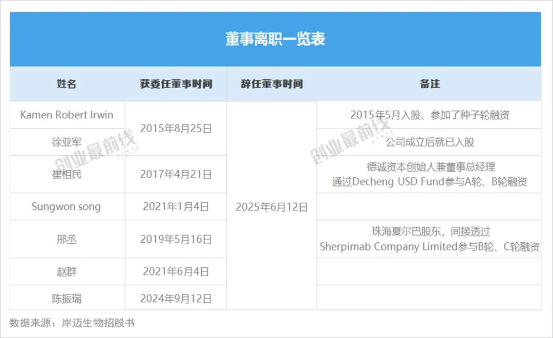 更蹊蹺的是,就在岸邁生物遞表港交所前5天(即6月12日),公司的7位董事(Kamen Robert Irwin、徐亞軍、崔相民、Sungwon Song、邢丞、趙群、陳振瑞)同時辭職。