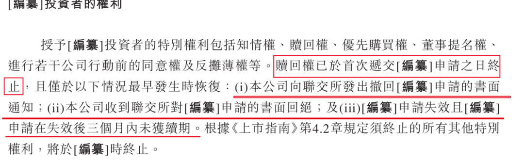 具體而言,包括公司向港交所發(fā)出撤回上市申請的書面通知,收到港交所對上市申請的書面回絕,以及在上市申請失效且上市申請在失效后三個月內未獲續(xù)期,倘若出現上述任一情況,贖回權仍然會恢復。