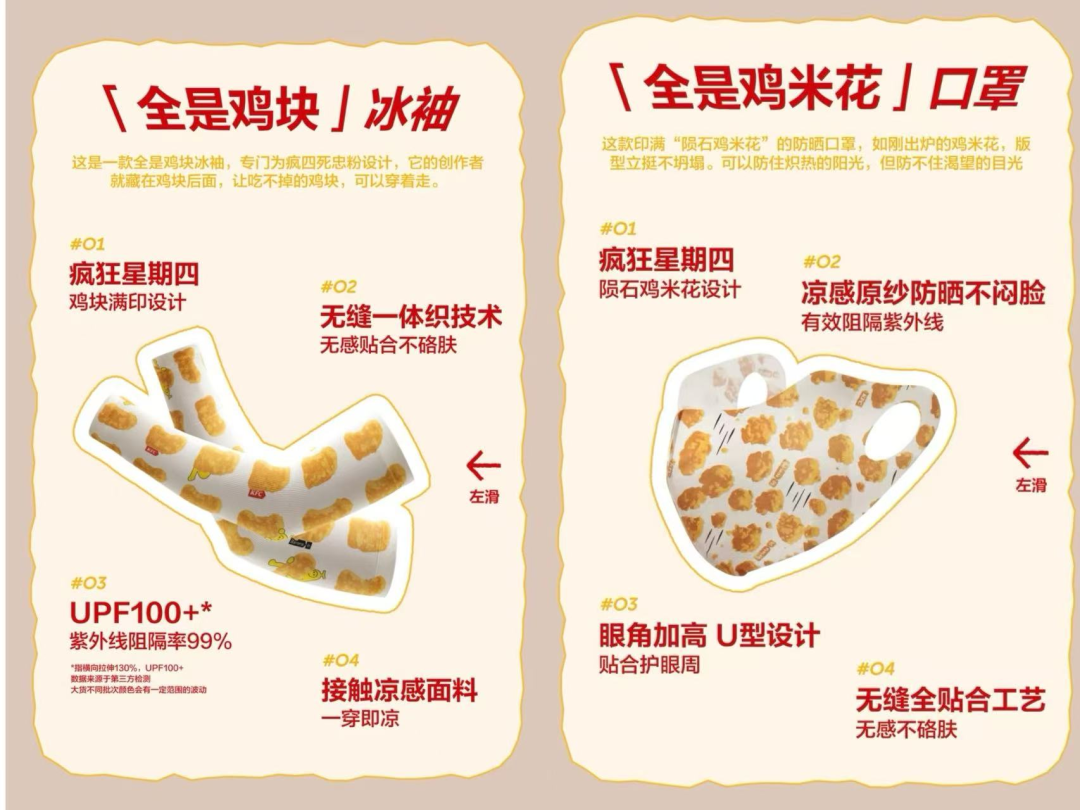 近期,蕉內(nèi)與肯德基聯(lián)名,購買“瘋狂星期四”指定產(chǎn)品便可獲得“全是雞塊”冰袖和“全是雞米花”口罩。