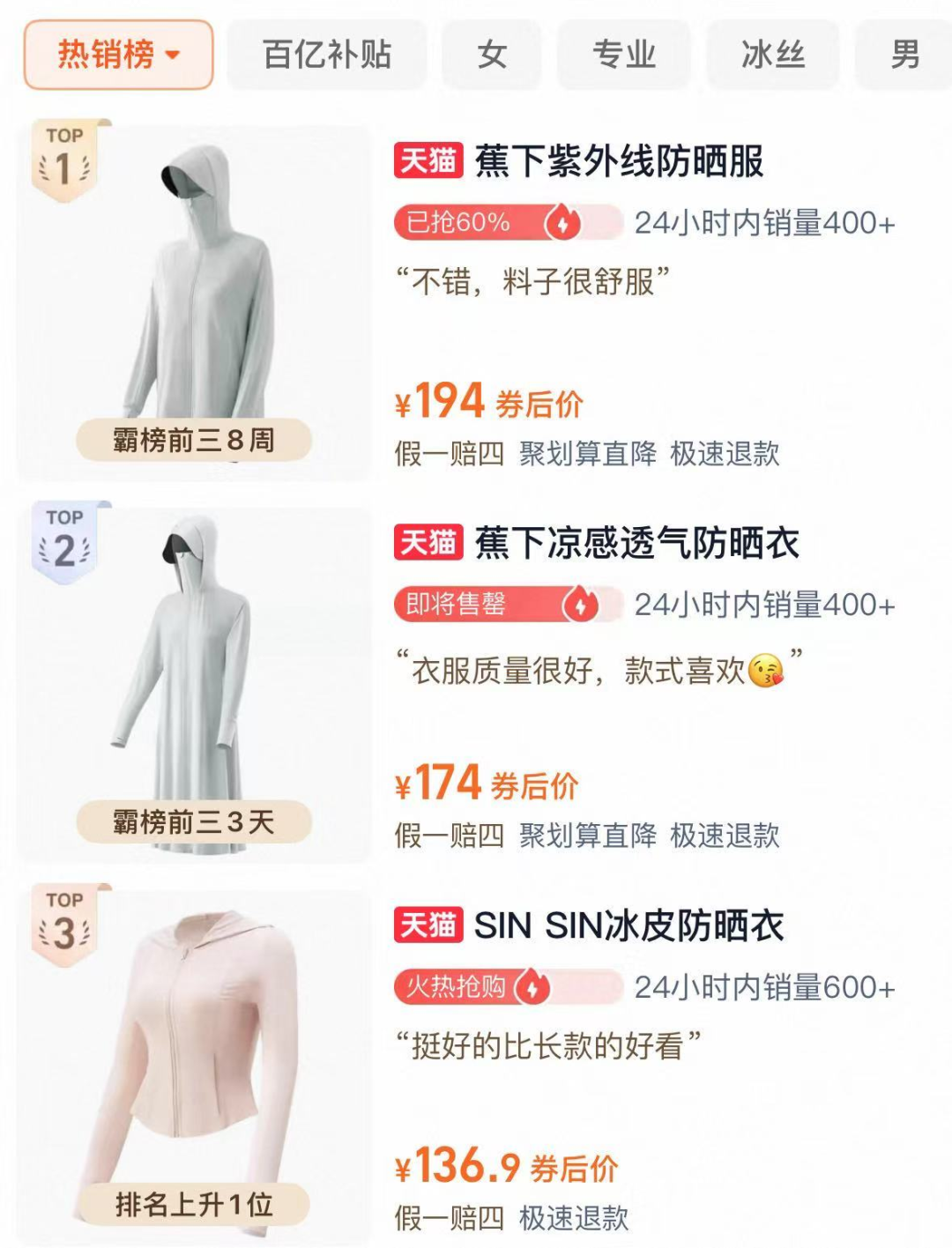 今年天貓防曬服熱銷榜單的前五名中,蕉下的產(chǎn)品占了3個席位,并且排名第一的蕉下防曬服已經(jīng)霸榜前三8周;在剛剛結(jié)束的天貓618的服飾銷售榜中,除了優(yōu)衣庫、UR、ZARA“三巨頭”之外,蕉下和蕉內(nèi)分列三、四名。