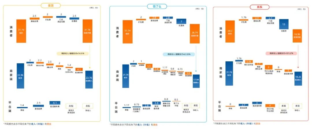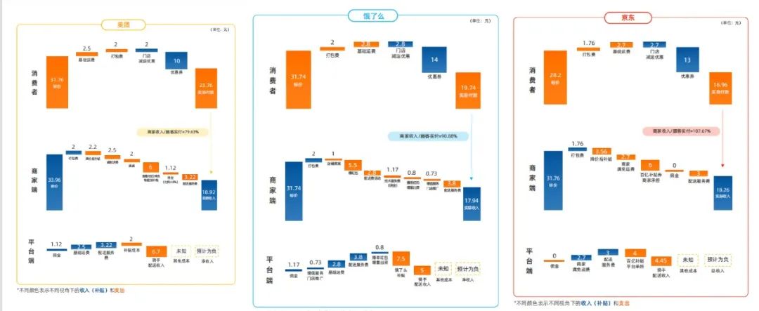 從平臺端看,餓了么的汲取能力更強,各類費用總額達(dá)9.3元,占消費者實付額的35%,遠(yuǎn)超美團和京東,美團由于并未發(fā)放優(yōu)惠券對消費者進行補貼,其費用占比僅為25%。在平臺凈收入方面,京東預(yù)計至少單均虧損1.3元。