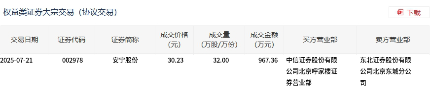 7月21日,安寧股份大宗交易成交32萬股,成交額967.36萬元,占當(dāng)日總成交額的3.49%,成交價(jià)30.23元,較市場(chǎng)收盤價(jià)30.85元折價(jià)2.01%。