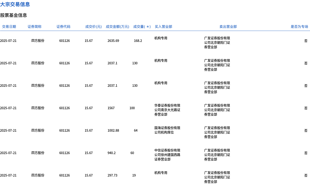 7月21日,四方股份大宗交易成交684萬股,成交額1.07億元,占當(dāng)日總成交額的21.72%,成交價(jià)15.67元,較市場收盤價(jià)17.46元折價(jià)10.25%。