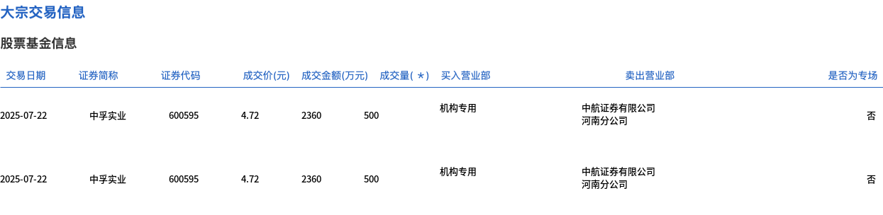 7月22日,中孚實業(yè)大宗交易成交1000萬股,成交額4720萬元,占當(dāng)日總成交額的7.93%,成交價4.72元,較市場收盤價4.79元折價1.46%。