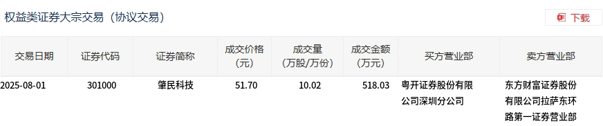 8月1日,肇民科技大宗交易成交10.02萬股,成交額518.03萬元,占當(dāng)日總成交額的2.88%,成交價51.7元,較市場收盤價42.78元溢價20.85%。