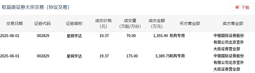 8月1日,星網宇達大宗交易成交245萬股,成交額4745.65萬元,占當日總成交額的19.75%,成交價19.37元,較市場收盤價21.44元折價9.65%。