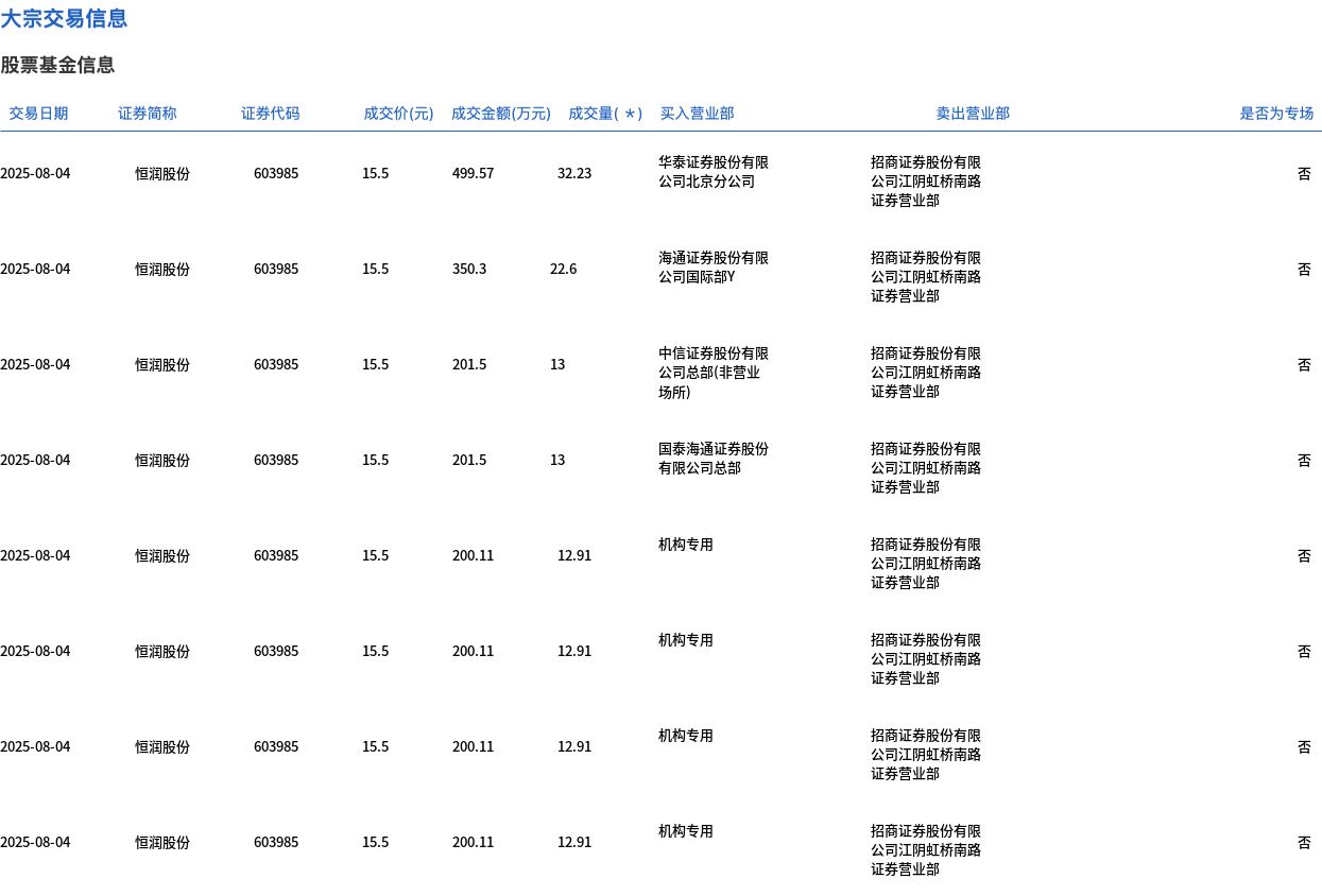 8月4日,恒潤(rùn)股份大宗交易成交132.47萬股,成交額2053.31萬元,占當(dāng)日總成交額的7.43%,成交價(jià)15.5元,較市場(chǎng)收盤價(jià)17.18元折價(jià)9.78%。