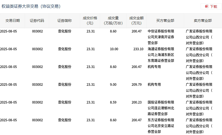 8月5日,壺化股份大宗交易成交53.39萬(wàn)股,成交額1244.53萬(wàn)元,占當(dāng)日總成交額的9.09%,成交價(jià)23.31元,較市場(chǎng)收盤(pán)價(jià)25.98元折價(jià)10.28%。