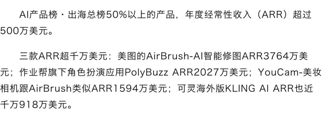 AI產(chǎn)品榜還指出,出海總榜50%以上的產(chǎn)品,年度經(jīng)常性收入(ARR)超過500萬美元。