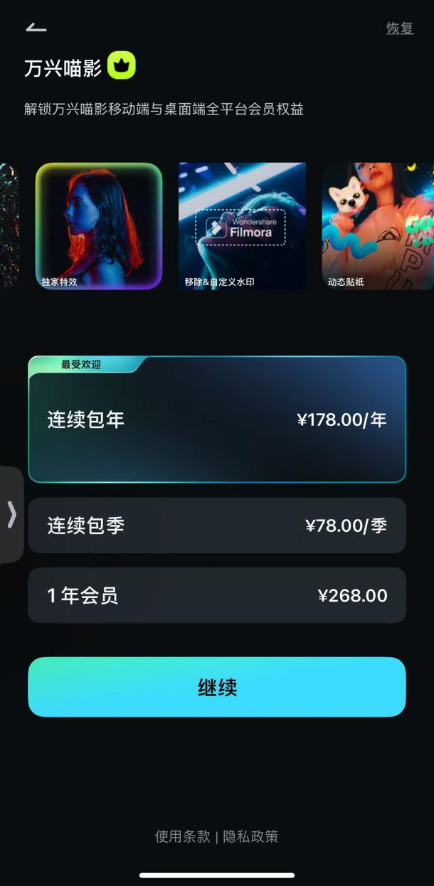 以國內(nèi)版萬興喵影為例,其只有一種VIP權(quán)益,一年會員定價為268元,連續(xù)包季和連續(xù)包年的價格分別為78元/季和178元/年。
