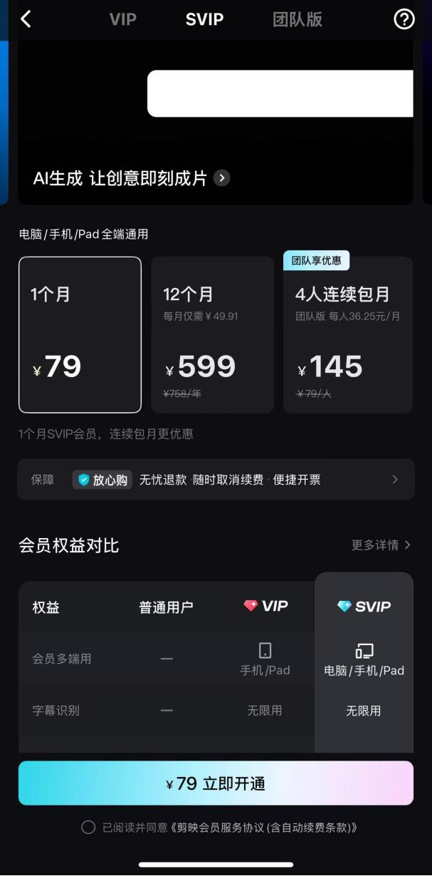 作為對比,剪映會員權(quán)益分為VIP和SVIP,其中VIP訂閱價格為30元/月,包年價格為218元/年,SVIP訂閱價格為79元/月,包年價格為599元/年,兩種權(quán)益在享受積分、素材庫和功能限制上有所差異。