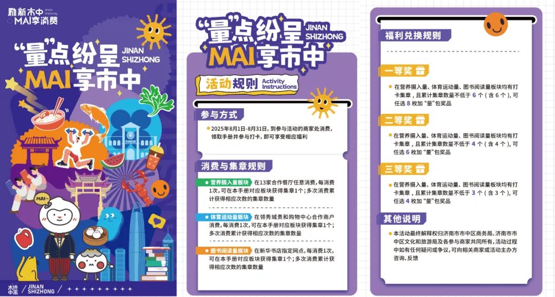 消費(fèi)集章兌好獎(jiǎng),互動(dòng)體驗(yàn)樂(lè)趣多。本次活動(dòng)特別推出“消費(fèi)集章兌好獎(jiǎng)”互動(dòng)環(huán)節(jié),增添趣味性與獲得感。即日起,“‘量’點(diǎn)紛呈 MAI享市中”專(zhuān)屬消費(fèi)活動(dòng)手冊(cè)限量發(fā)放。領(lǐng)取手冊(cè)后,市民在市中區(qū)參與活動(dòng)的指定餐飲、運(yùn)動(dòng)、書(shū)店商戶(hù)進(jìn)行任意金額消費(fèi),憑消費(fèi)憑證即可在手冊(cè)上獲得對(duì)應(yīng)板塊(美食、運(yùn)動(dòng)、閱讀)的集章1枚,累積集齊特定數(shù)量的印章即可兌換價(jià)值豐厚的“加量包”獎(jiǎng)品(具體獎(jiǎng)項(xiàng)設(shè)置及兌獎(jiǎng)細(xì)則詳見(jiàn)活動(dòng)手冊(cè))。