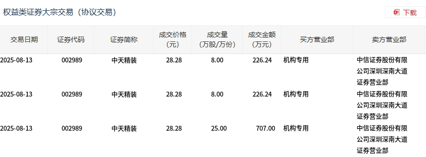 8月13日,中天精裝大宗交易成交41萬(wàn)股,成交額1159.48萬(wàn)元,占當(dāng)日總成交額的5.4%,成交價(jià)28.28元,較市場(chǎng)收盤價(jià)31.55元折價(jià)10.36%。