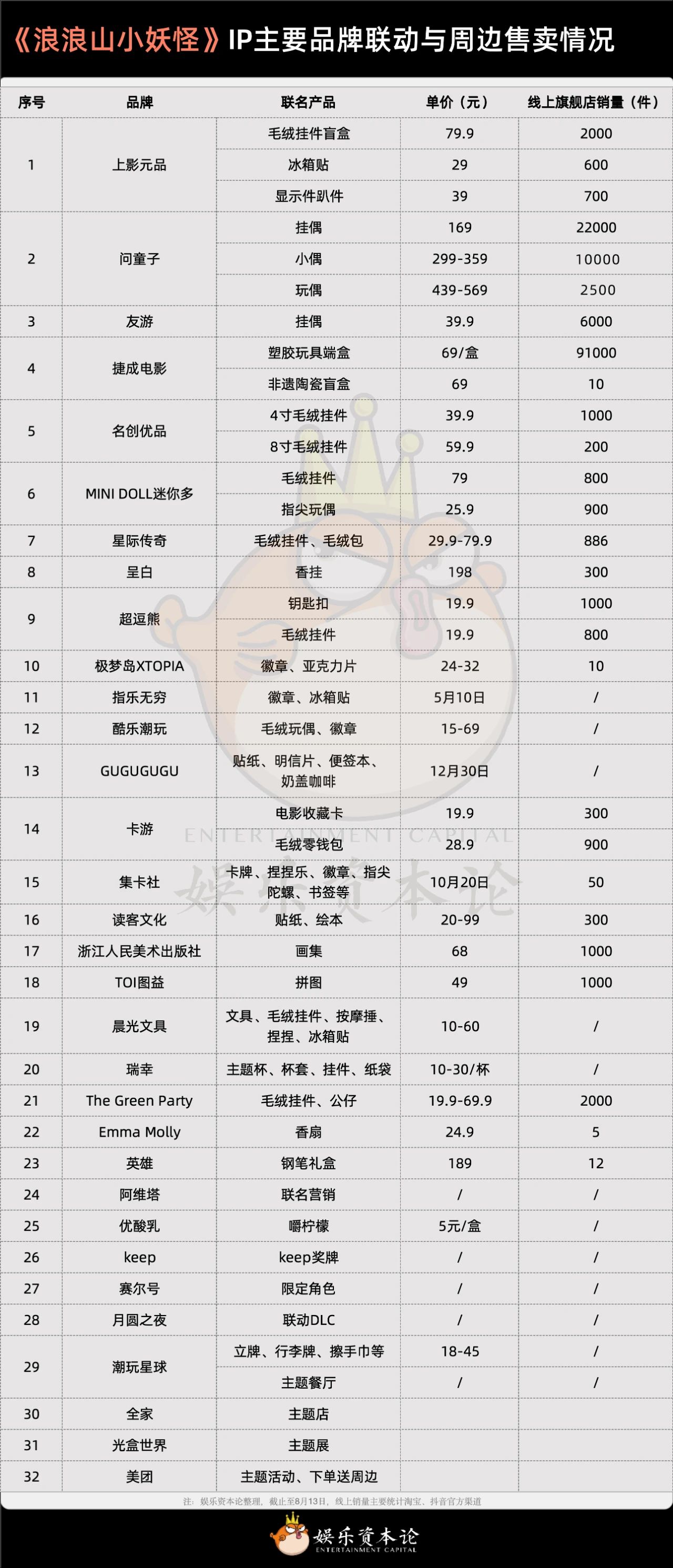據(jù)娛樂(lè)資本論統(tǒng)計(jì),浪浪山聯(lián)名的32個(gè)品牌中,18個(gè)是潮玩、周邊類品牌,4家生活消費(fèi)品牌,2個(gè)出版類,2款游戲,還涉及到汽車、app、主題展陳等。