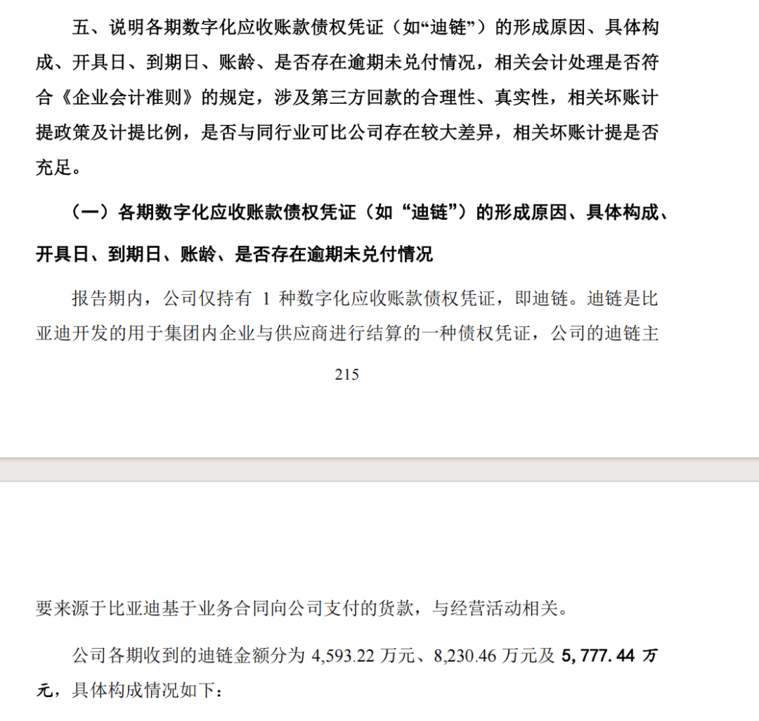 大鵬工業(yè)回復(fù)稱,報告期內(nèi),公司僅持有1種數(shù)字化應(yīng)收賬款憑證,即迪鏈。2021年至2023年,公司收到的迪鏈金額分別為4593.22萬元、8230.46萬元及5777.44萬元。報告期內(nèi),不存在逾期兌付的情況。與迪鏈相關(guān)的會計處理符合《企業(yè)會計準(zhǔn)則》的規(guī)定。