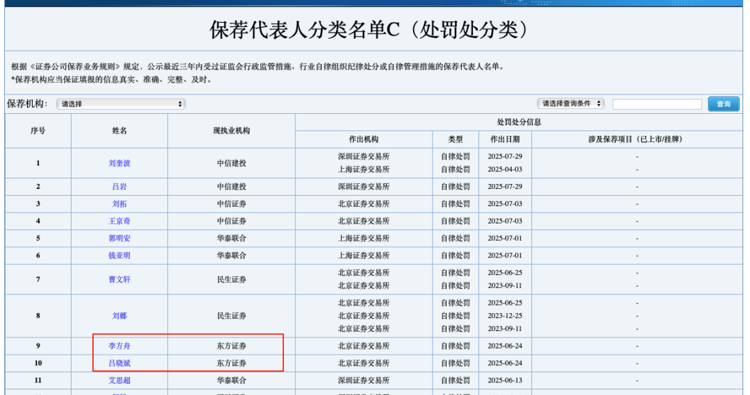 值得注意的是,2025年7月,中國證券業(yè)協(xié)會發(fā)布的保薦代表人分類名單顯示,東方證券保薦代表人李方舟、呂曉斌因在大鵬工業(yè)IPO項目中履職違規(guī),被北交所采取自律監(jiān)管措施。