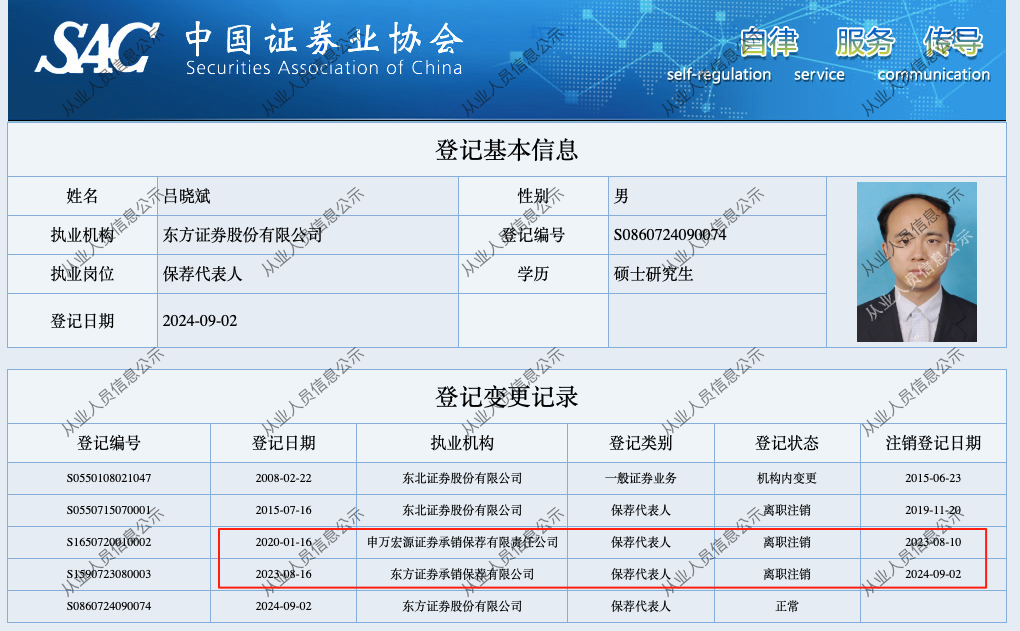 這背后是“項目隨人走”的情況。保代呂曉斌的履歷顯示,其2020年1月在申萬宏源時保薦大鵬工業(yè)創(chuàng)業(yè)板IPO,2023年6月東方證券接手后,他8月就跳槽到東方證券繼續(xù)保薦這個項目。