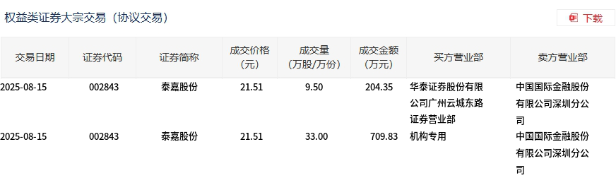8月15日,泰嘉股份大宗交易成交42.5萬股,成交額914.18萬元,占當(dāng)日總成交額的2.06%,成交價(jià)21.51元,較市場收盤價(jià)24.44元折價(jià)11.99%。