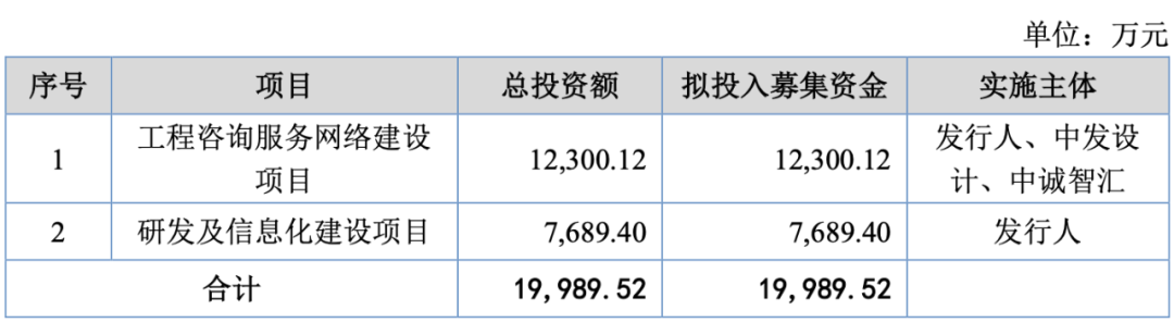 中誠(chéng)咨詢(xún)首次遞交的招股書(shū)顯示,該公司原計(jì)劃為4個(gè)項(xiàng)目募資,分別是工程咨詢(xún)服務(wù)網(wǎng)絡(luò)建設(shè)項(xiàng)目、研發(fā)及信息化建設(shè)項(xiàng)目、EPC業(yè)務(wù)拓展項(xiàng)目、補(bǔ)充流動(dòng)資金,分別募集資金1.23億元、7689.4萬(wàn)元、7000萬(wàn)元及6000萬(wàn)元,合計(jì)募資約3.3億元。