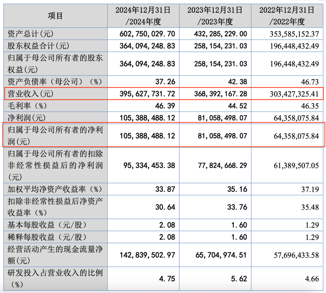 招股書(shū)顯示,2022年至2024年(以下簡(jiǎn)稱(chēng)“報(bào)告期內(nèi)”),該公司的營(yíng)收分別為3.03億元、3.68億元及3.96億元,復(fù)合增長(zhǎng)率為14.19%;歸母凈利潤(rùn)分別為6435.81萬(wàn)元、8105.85萬(wàn)元和1.05億元,復(fù)合增長(zhǎng)率為27.97%。