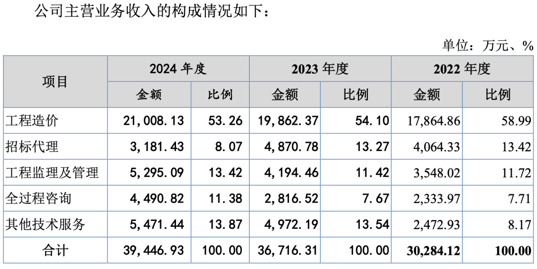 在公司的主營(yíng)業(yè)務(wù)中,工程造價(jià)業(yè)務(wù)貢獻(xiàn)的營(yíng)收占比一直穩(wěn)定在50%以上,報(bào)告期內(nèi)分別為58.99%、54.1%、53.26%。