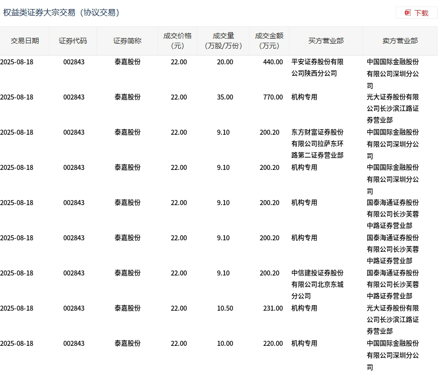 8月18日,泰嘉股份大宗交易成交121萬(wàn)股,成交額2662萬(wàn)元,占當(dāng)日總成交額的4.11%,成交價(jià)22元,較市場(chǎng)收盤價(jià)25.07元折價(jià)12.25%。