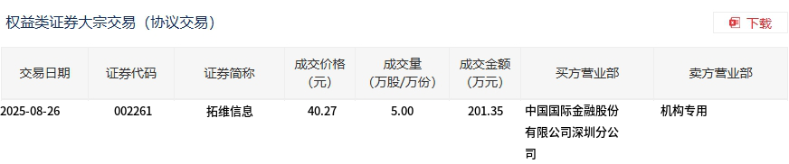 8月26日,拓維信息大宗交易成交5萬股,成交額201.35萬元,占當(dāng)日總成交額的0.04%,成交價(jià)40.27元,較市場收盤價(jià)40.27元持平。