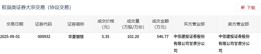 9月1日,華菱鋼鐵大宗交易成交102.2萬(wàn)股,成交額546.77萬(wàn)元,占當(dāng)日總成交額的0.82%,成交價(jià)5.35元,較市場(chǎng)收盤價(jià)5.91元折價(jià)9.48%。