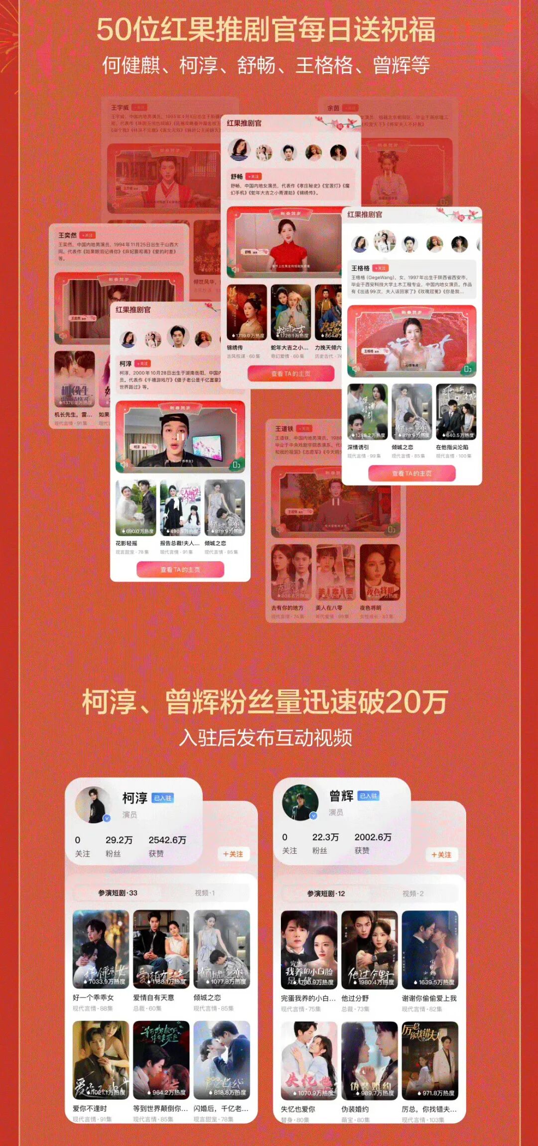 紅果坐穩(wěn)免費(fèi)短劇第一平臺后,于春節(jié)檔推出一系列運(yùn)營活動(dòng):除了百部新劇,還有短劇紅人們的團(tuán)建綜藝《出發(fā)吧短??!》;邀請到柯淳、曾輝等22位短劇演員入駐,策劃了50位短劇紅人作為“推劇官”每日視頻送祝福;嘗試新劇的平臺X廠牌X演員站內(nèi)合力宣發(fā),首次出演短劇的舒暢不僅入駐紅果,還空降評論區(qū)互動(dòng)。