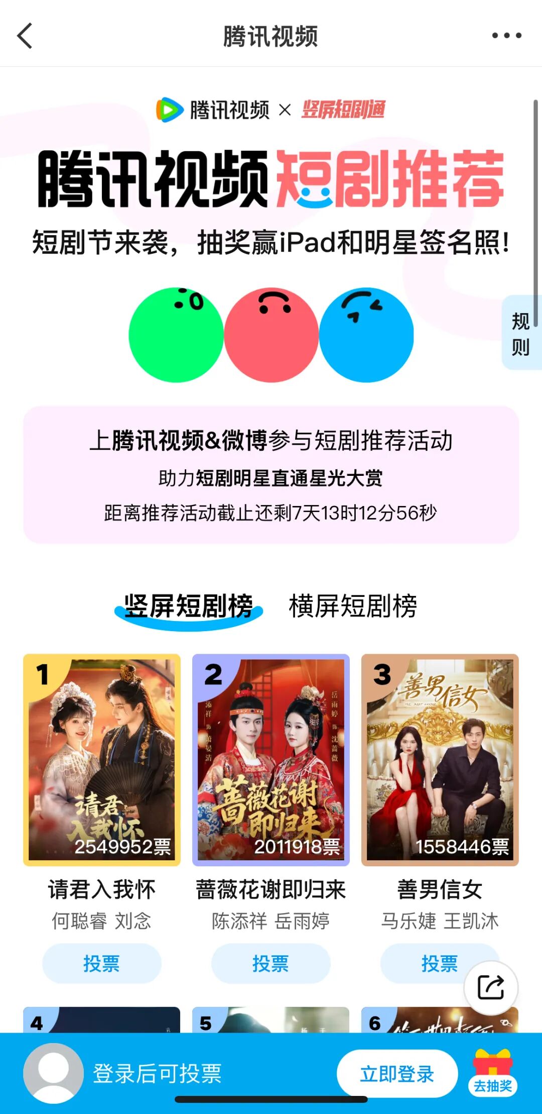 騰訊視頻則在春節(jié)檔規(guī)格上升級,聯(lián)合微博打造“騰訊視頻短劇節(jié)”,網(wǎng)羅三十余橫豎人氣演員直播營業(yè)、福利派送,打榜活動(dòng)更拿出了“TOP1主演直通星光大賞”的彩頭,目前豎短榜單TOP3都已投到幾百萬票。不得不說,姜還是老的辣。