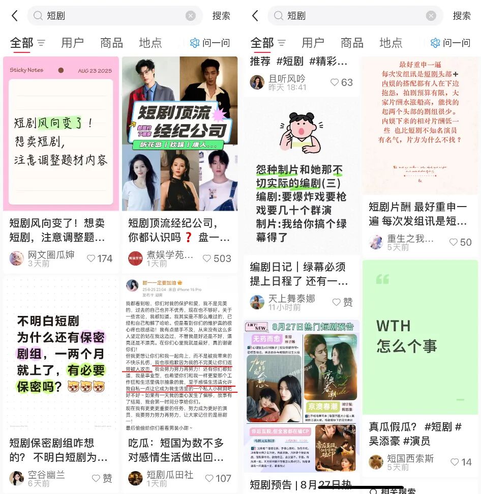 當(dāng)然,小紅書在短劇生態(tài)中的首要定位肯定還是社區(qū)。除了有討論與二創(chuàng)習(xí)慣的短劇用戶,大量演員、廠牌、從業(yè)者、營銷號都在小紅書活躍,很多爆料、話題或選角瓜都是由小紅書發(fā)酵到微博、豆瓣去的——這也是短國與內(nèi)娛的一大差異。