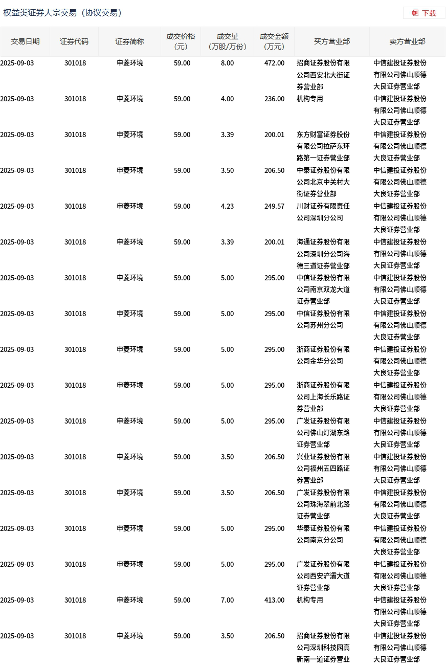 9月3日,申菱環(huán)境大宗交易成交79.01萬股,成交額4661.59萬元,占當(dāng)日總成交額的3.95%,成交價(jià)59元,較市場收盤價(jià)74.27元折價(jià)20.56%。