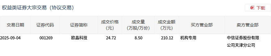 9月4日,歐晶科技大宗交易成交8.5萬股,成交額210.12萬元,占當(dāng)日總成交額的1.14%,成交價(jià)24.72元,較市場(chǎng)收盤價(jià)28.12元折價(jià)12.09%。