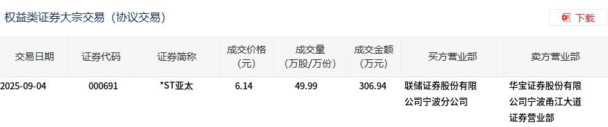 9月4日,*ST亞太大宗交易成交49.99萬股,成交額306.94萬元,占當(dāng)日總成交額的23.1%,成交價6.14元,較市場收盤價6.14元持平。