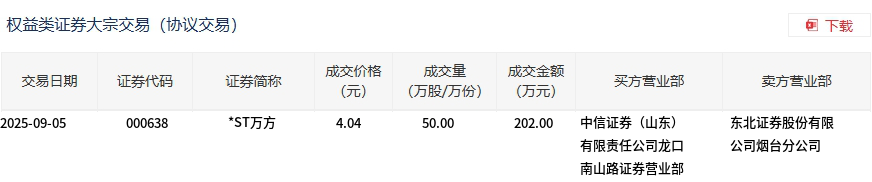 *ST萬方今日大宗交易折價成交50萬股,成交額202萬元